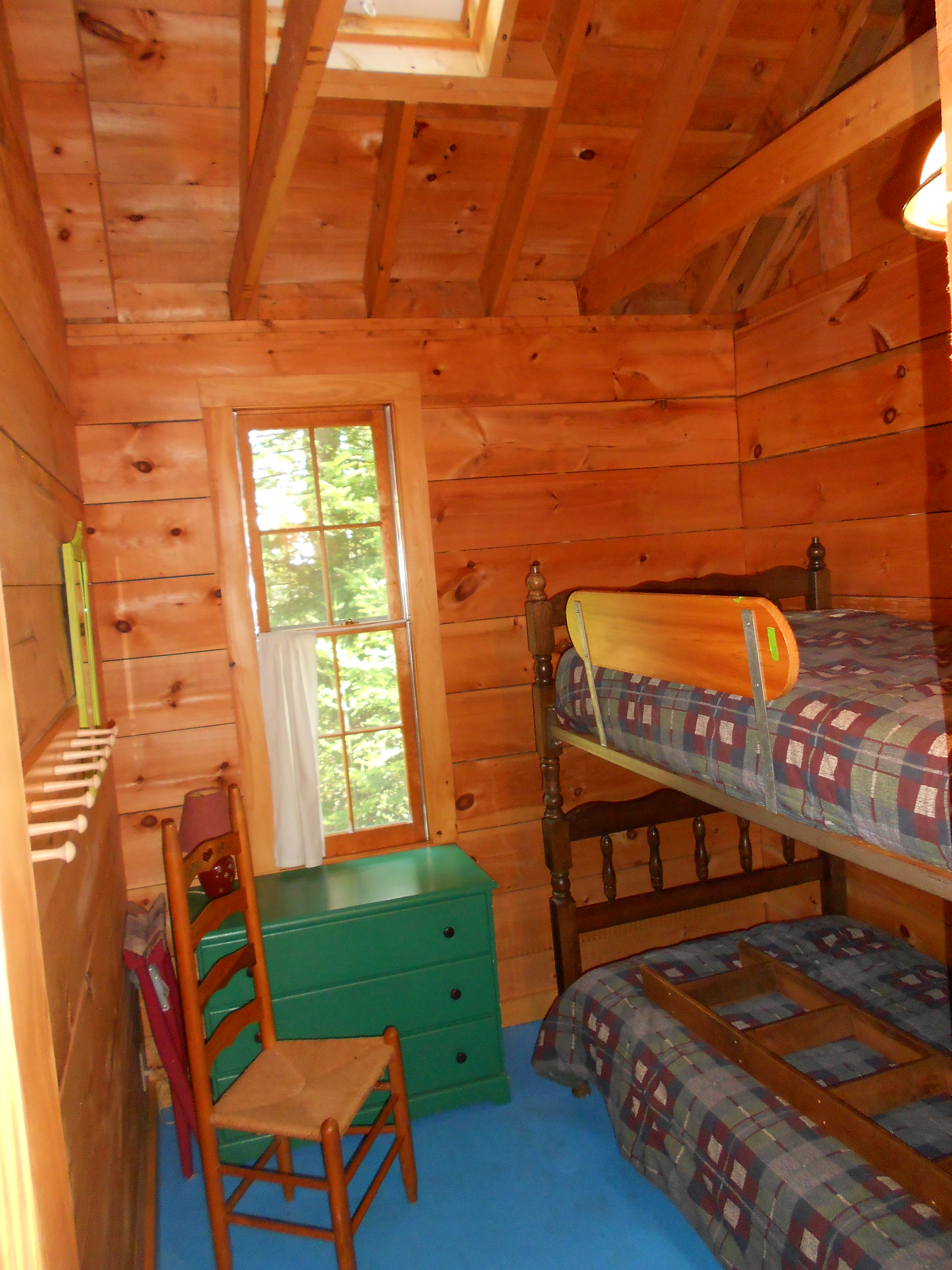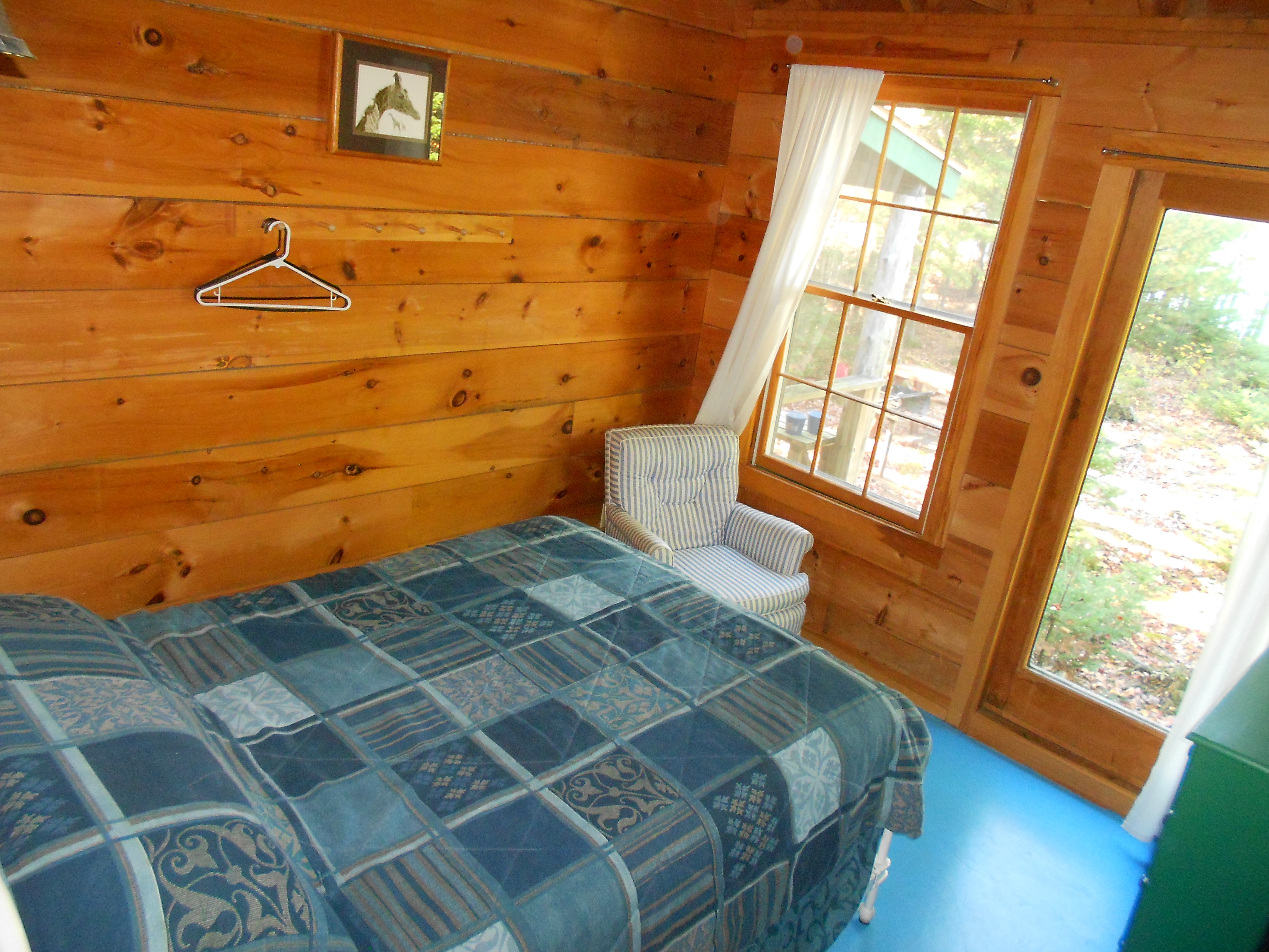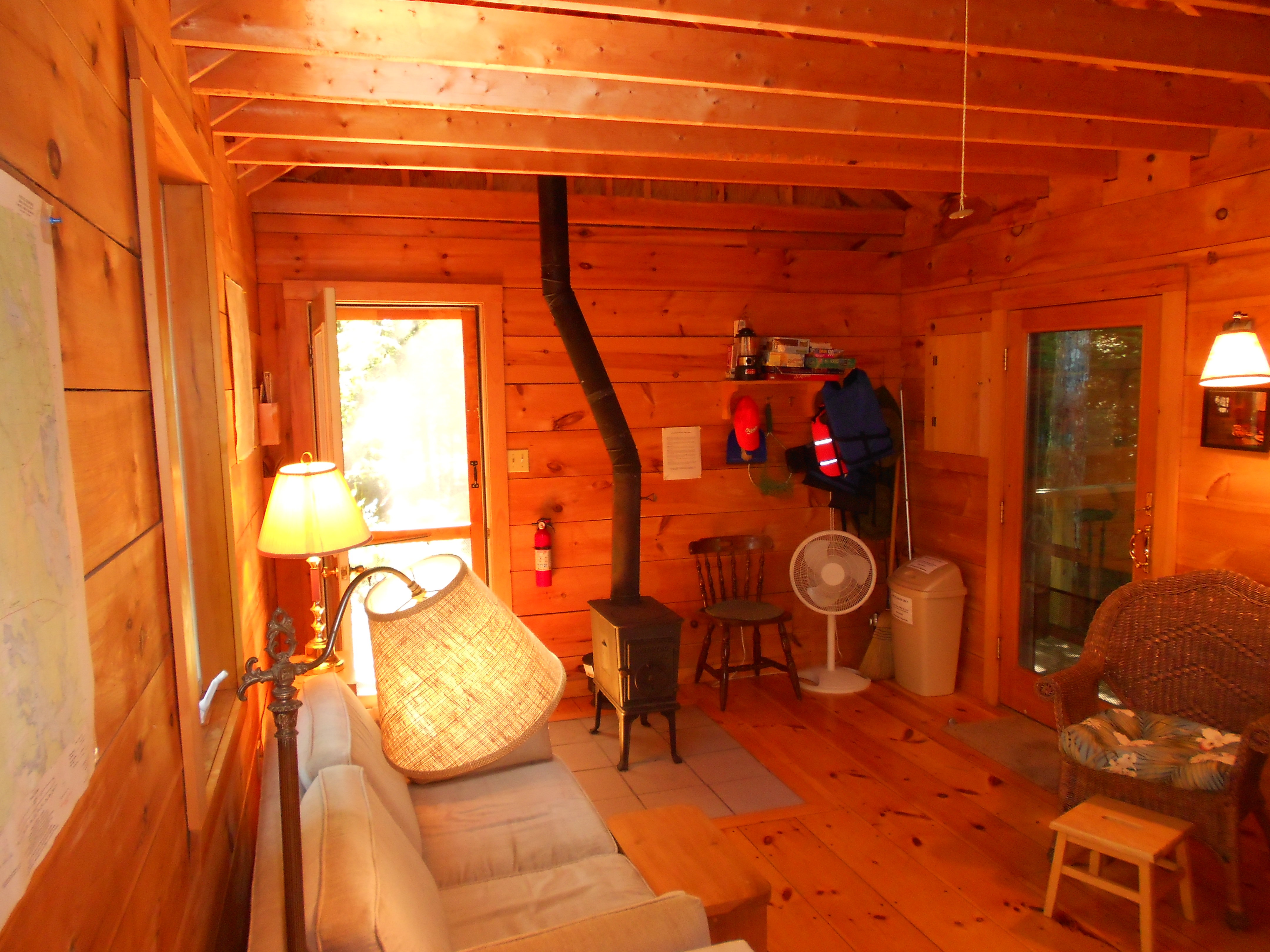 The Shingle Cabin has an open living/dining area with a galley kitchen, bathroom and 2 bedrooms on a single level. The larger bedroom has a queen size bed and the small bedroom has bunkbeds. The porch looks out over the water (great sunsets) with a picnic table and fireplace in front. The cabin is equipped with dishes, pots and pans, microwave, coffeemaker, toaster, refrigerator and gas stove. The living area has a wood stove for cool evenings or mornings. All bedding (sheets, blankets, pillows...) is provided (note bath towels are not included).